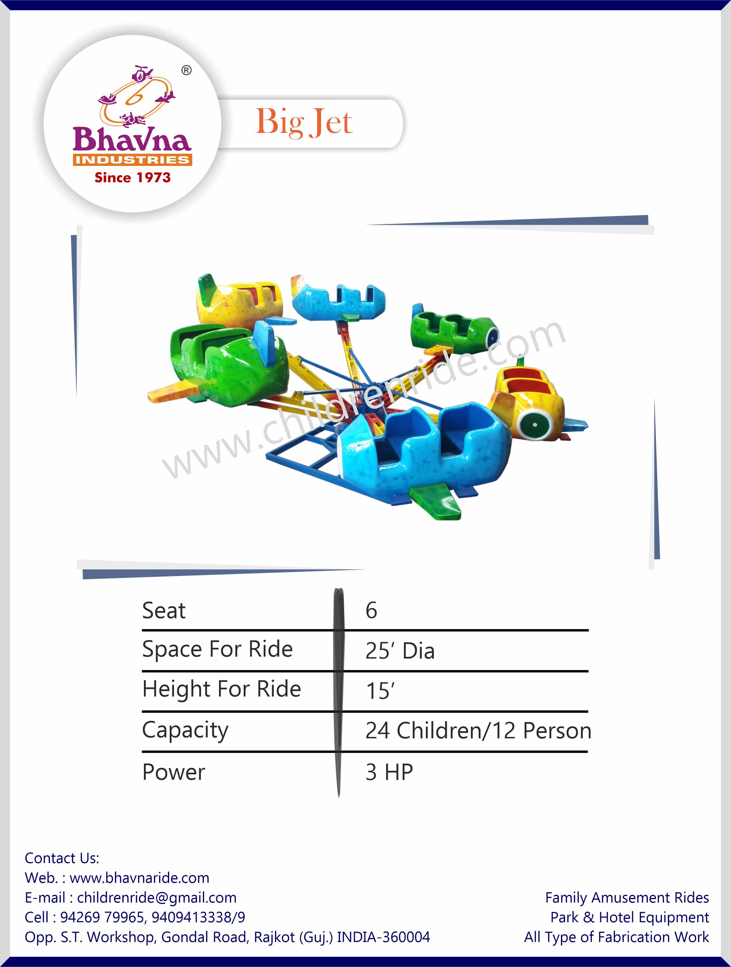For years, Bhavna Industries has been a trusted manufacturer of Big Jet amusement rides, offering various designs and sizes from our facility in Rajkot. Known for quality assurance and on-time delivery, the Big Jet is a popular family ride that provides fun and excitement for all ages. The seating capacity can be customized to meet specific requirements, ensuring it suits any park or attraction. With a focus on durability and enjoyment, Bhavna Industries' Big Jet ride is a top choice for operators looking to offer a thrilling, family-friendly experience.