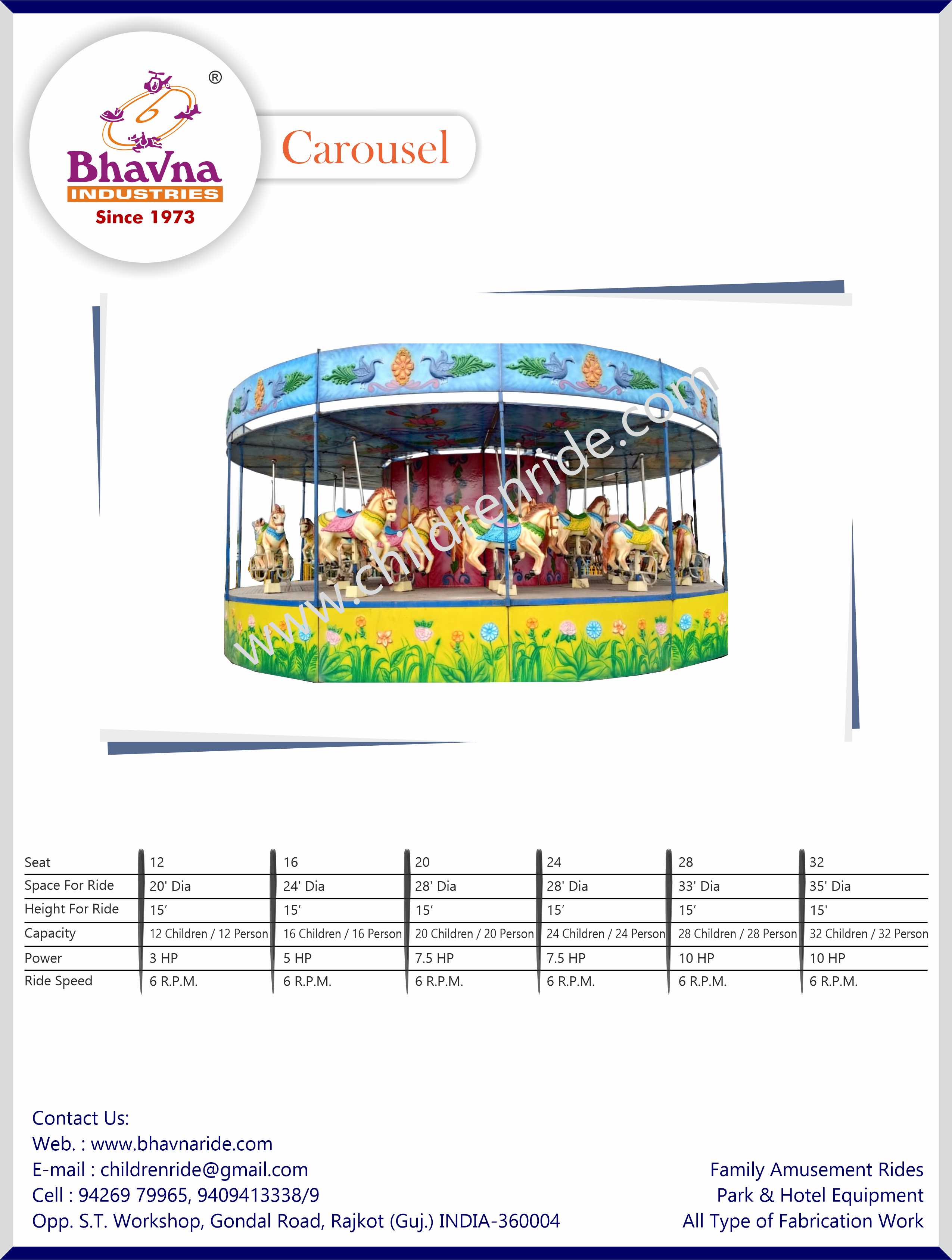 The classic Carousel Ride is a timeless attraction that delights both children and adults. Bhavna Industries offers customizable carousel rides with options for horse or animal-shaped gondolas. With a variety of design and color options, this ride can be tailored to fit any park theme. The gentle up-and-down motion provides a calm and joyful experience for riders, making it one of the most cherished rides in any amusement park or family entertainment center.