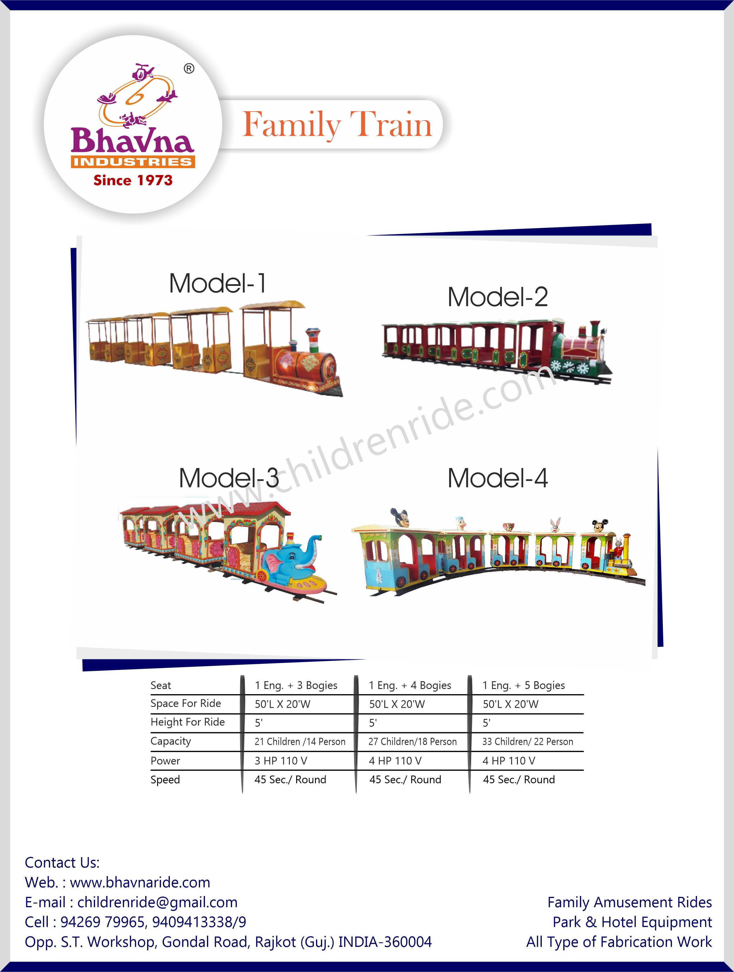 Bhavna Industries has been a trusted name in family amusement rides since 1975, and our Family Train Ride is one of our most popular offerings. This train ride is perfect for theme parks, fairs, and shopping malls, with customizable seating and length options. Whether for small spaces or large parks, our Family Train is designed for non-stop operation, ensuring a seamless and enjoyable ride experience for families. The traditional yet modern design makes it a visually appealing attraction that adds charm to any park while being hassle-free for operators to manage.