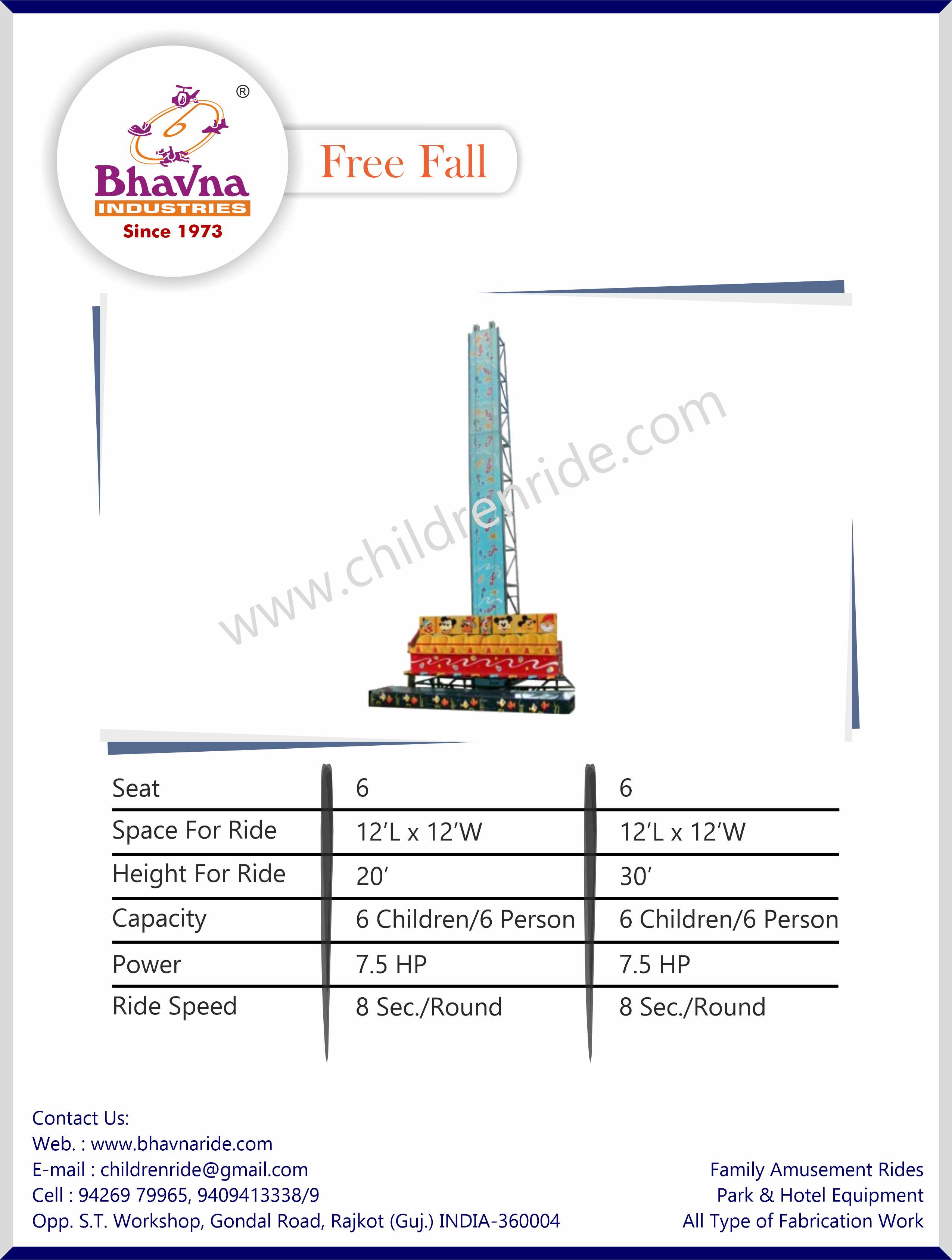 The Free Fall by Bhavna Industries is an iconic family thrill ride, combining the excitement of a classic shoot-the-chute with the adrenaline rush of a free fall tower. Designed to deliver maximum thrills in a compact footprint, the Free Fall takes 6 to 8 riders up to heights of 6 to 12 meters before a heart-pounding vertical drop.