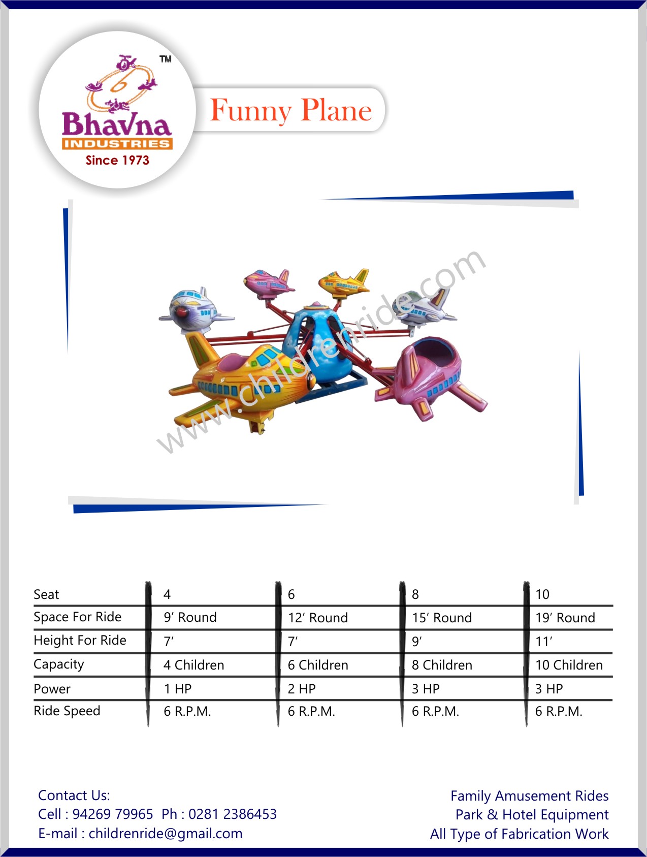 Combining visual appeal with advanced technology, Bhavna Industries' Funny Plane Rides offer thrilling experiences for children up to 15 years old. Available in various sizes and capacities, the Funny Plane is designed to be both exciting and visually striking from all angles, making it a popular attraction at amusement parks and fairs. With its unique design and versatility, this ride captivates young audiences and provides endless fun..