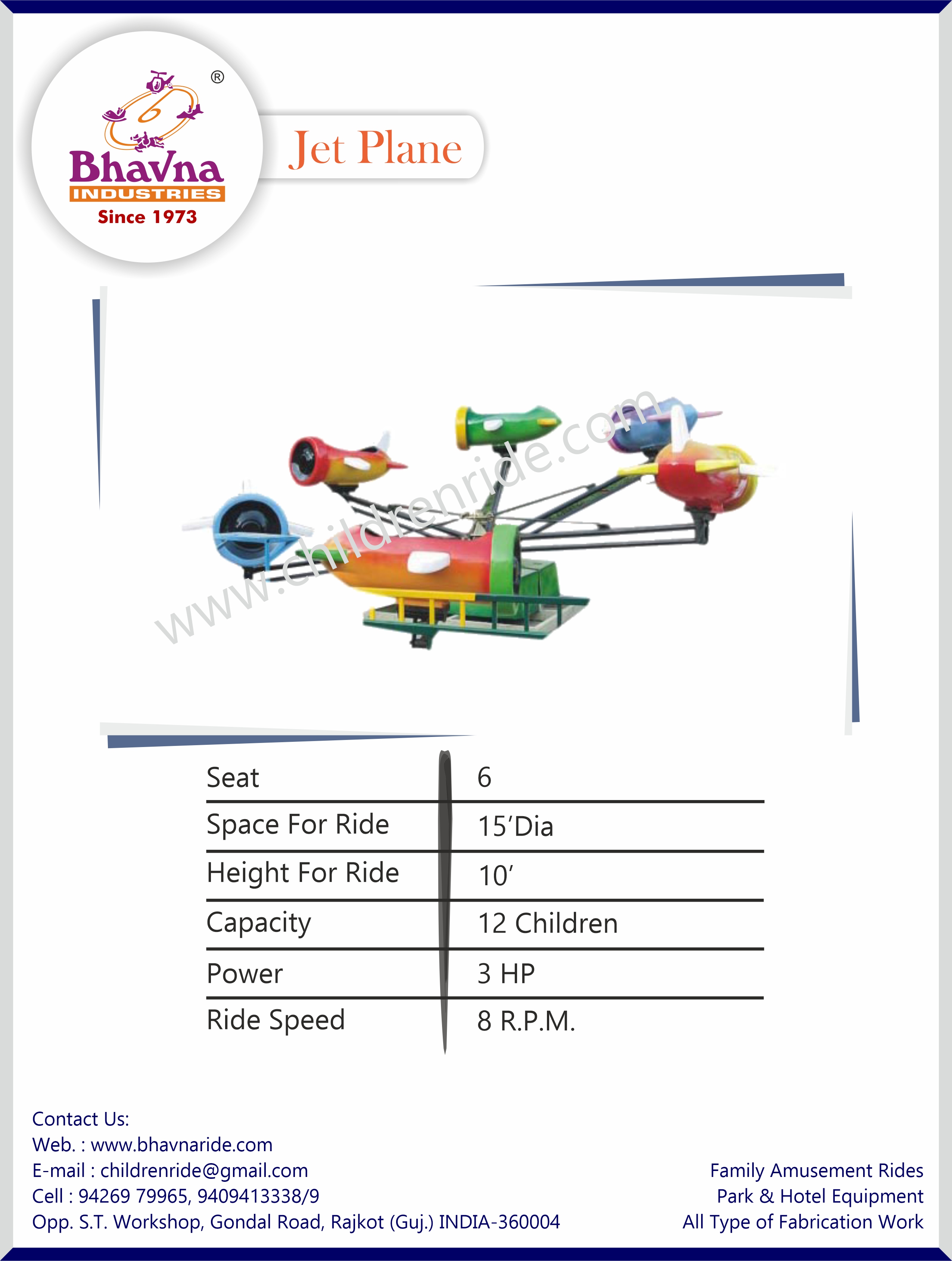 For many years, Bhavna Industries has been manufacturing Jet Plane amusement rides in a variety of designs and sizes from our base in Rajkot. Renowned for our commitment to quality assurance and on-time delivery, the Jet Plane is a popular, safe, and self-control ride designed specifically for kids. This ride allows young riders to experience the thrill of flying while being in full control of the ride's movements. Bhavna Industries has supplied Jet Plane rides to major markets across India, including Ahmedabad, Surat, Baroda, Jamnagar, Delhi, Mumbai, and Bengaluru, making it a trusted choice for amusement parks and fairs.