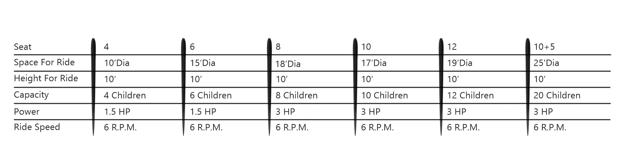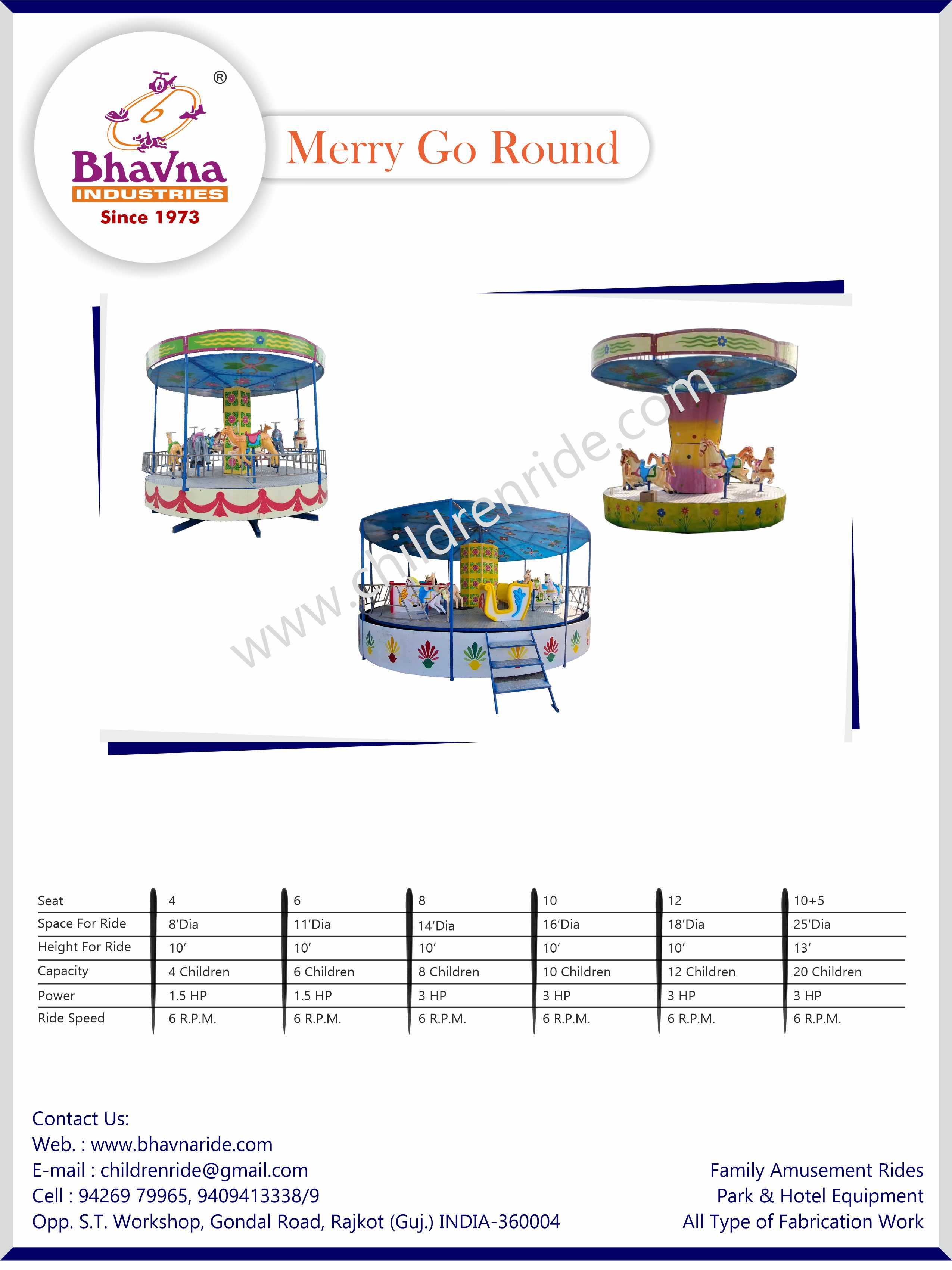 Bhavna Industries leads the industry in merry-go-round rides. Our carousel rides are designed for the entire family, featuring intricate gear work to create a galloping effect on the horses, all while delightful theme music plays. Choose from different themes or request custom designs to match your park's style.
