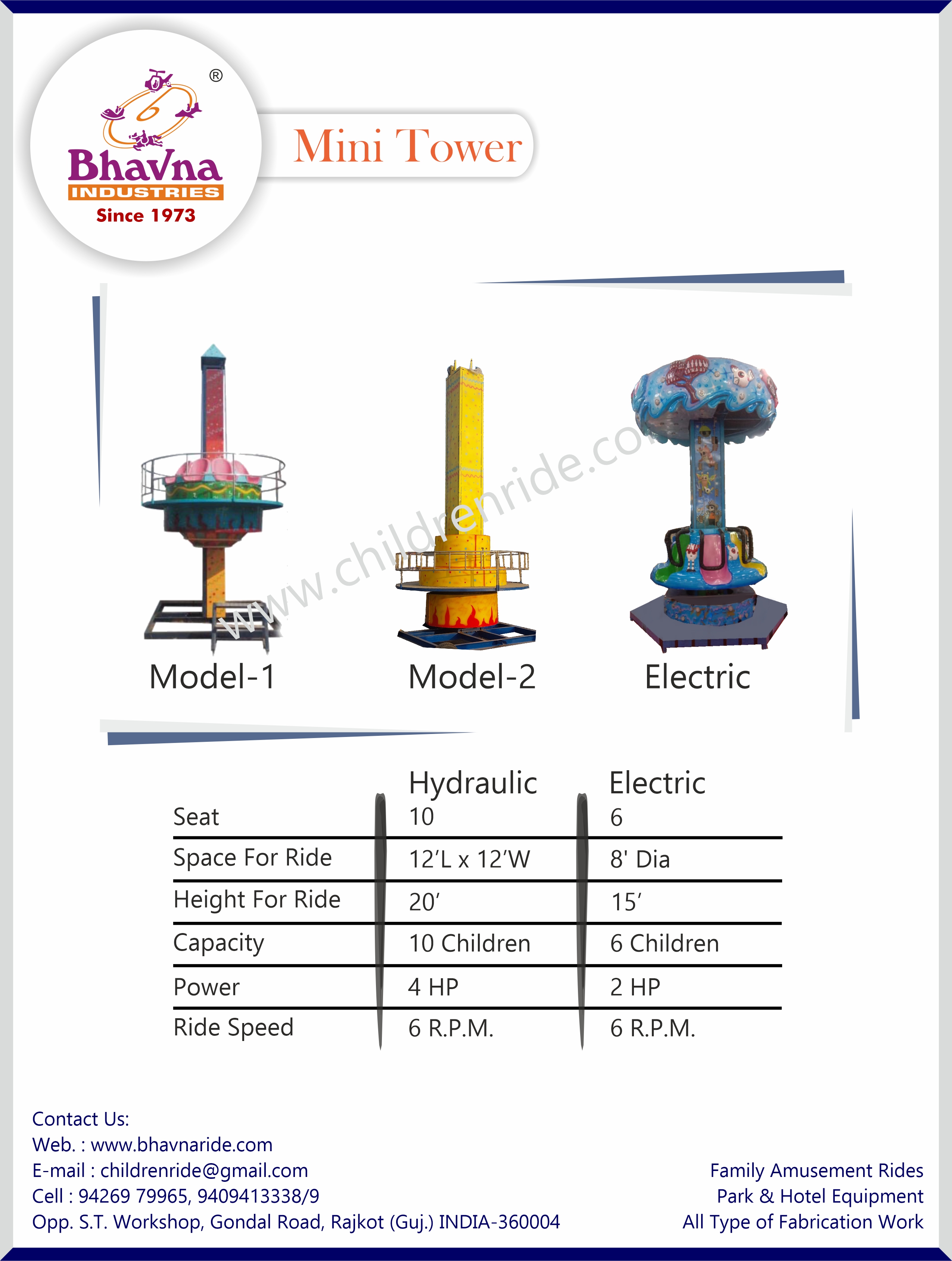Bhavna Industries proudly manufactures the Mini Tower, a highly profitable ride for operators. This amusement ride is popular at fairs due to its low maintenance and high earning potential. The Mini Tower offers a thrilling rotating and up-and-down motion, providing a joyful experience for riders along with great views from the top. Its compact design makes it a perfect attraction for both smaller parks and larger fairs, delivering consistent business success for its owners.For the youngest hunting for emotions we have built the Mini Tower, a smaller version of the revolving tower