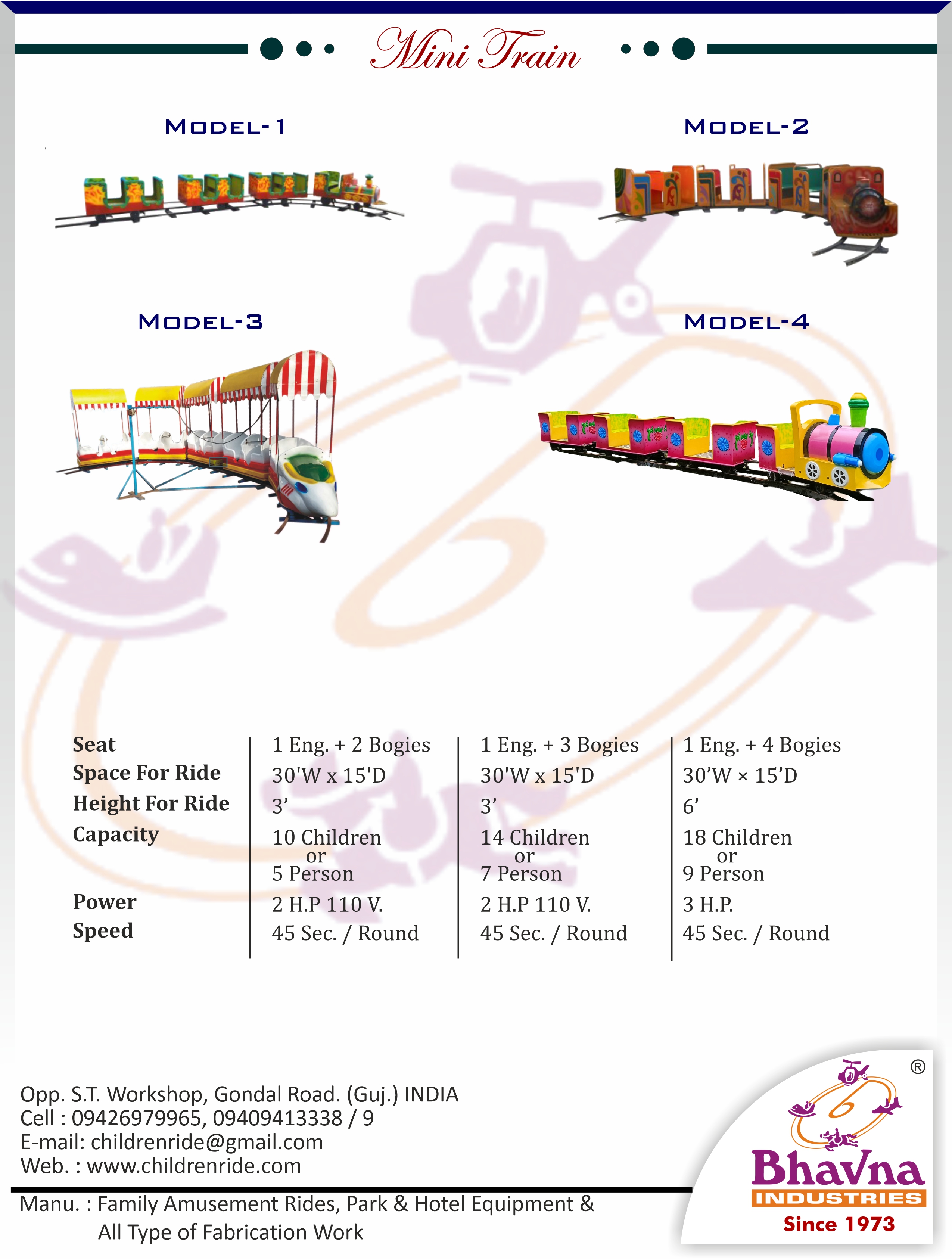 The Mini Train Ride by Bhavna Industries is ideal for amusement parks and family entertainment centers, especially for younger children aged 3 to 8. Available in various colors and designs, this train ride can be customized to match the theme of your park. Its small size, safe seating, and attractive design make it a go-to ride for families with young kids. The Mini Train is perfect for malls, events, and fairs. It offers a fun, interactive experience for children while being easy to maintain for operators.