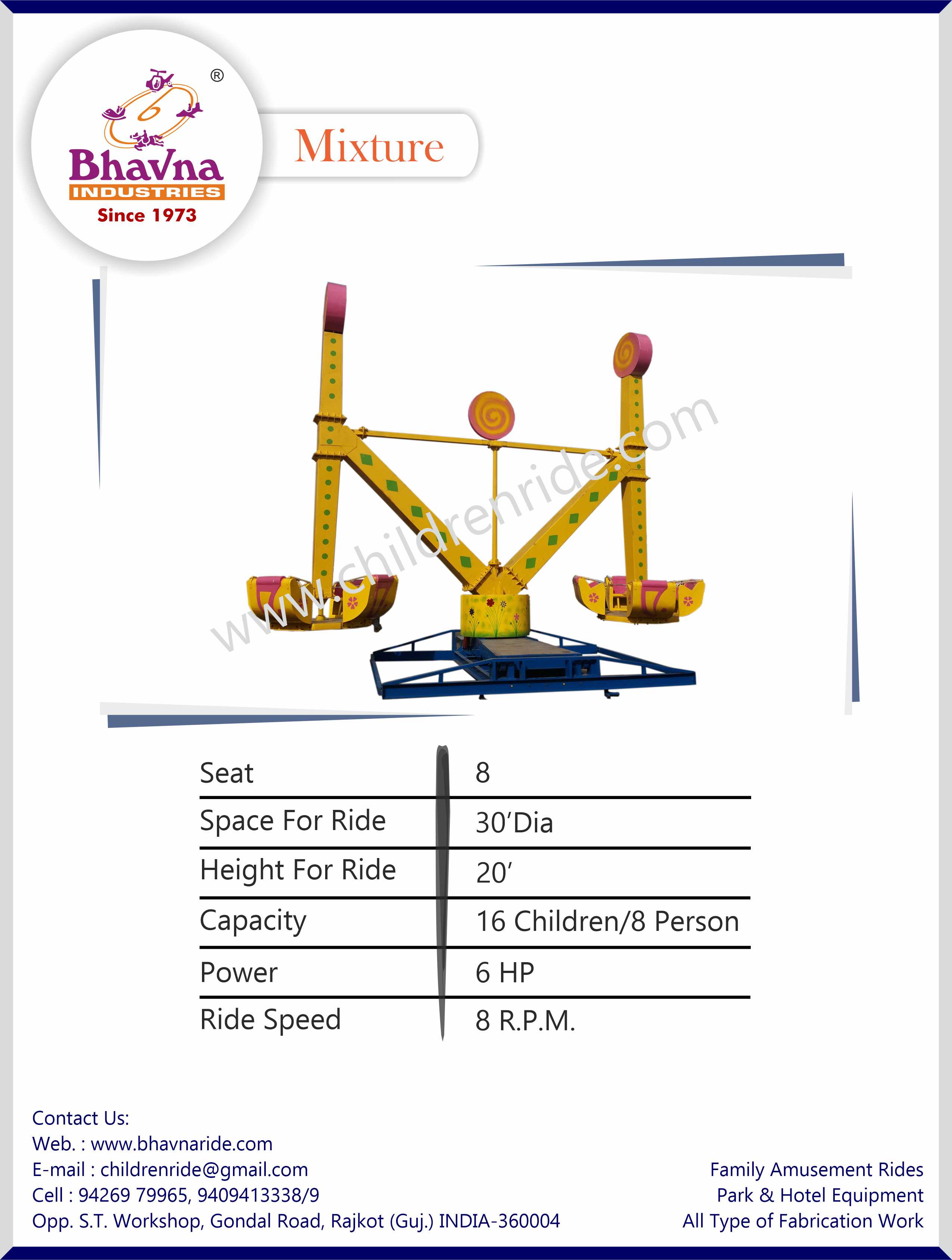 The Mixture Ride provides a gravity-defying adventure with rotating seats and thrilling spins. Bhavna Industries designs this mobile ride for ease of setup and dismantling, perfect for amusement parks and traveling fairs.