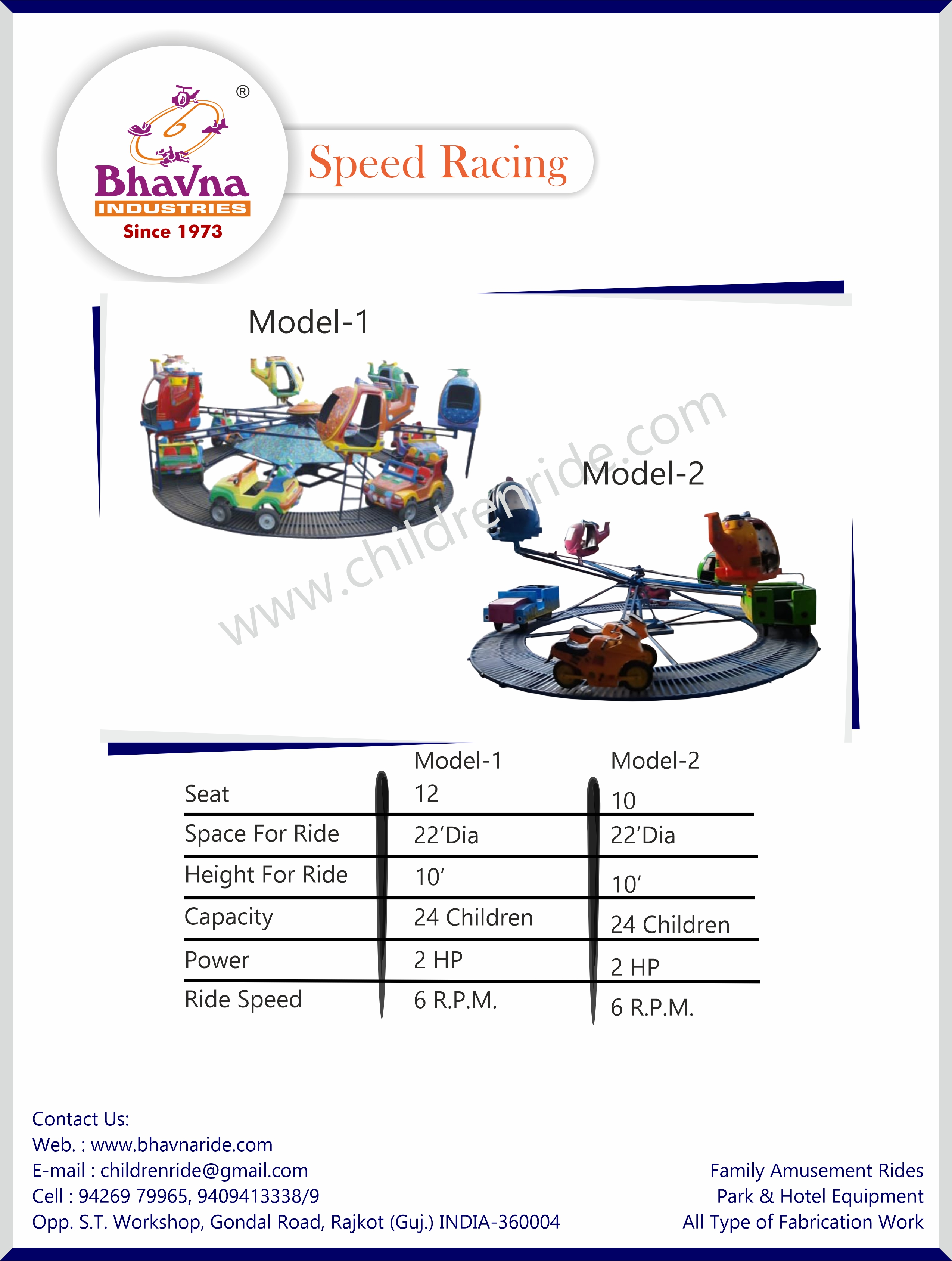 At Bhavna Industries, we design custom-built Speed Racing carnival rides for kids, ensuring high safety standards and comfort. This ride features vibrant graphics and offers customization options, making it a must-have for any amusement park looking to attract repeat visitors.