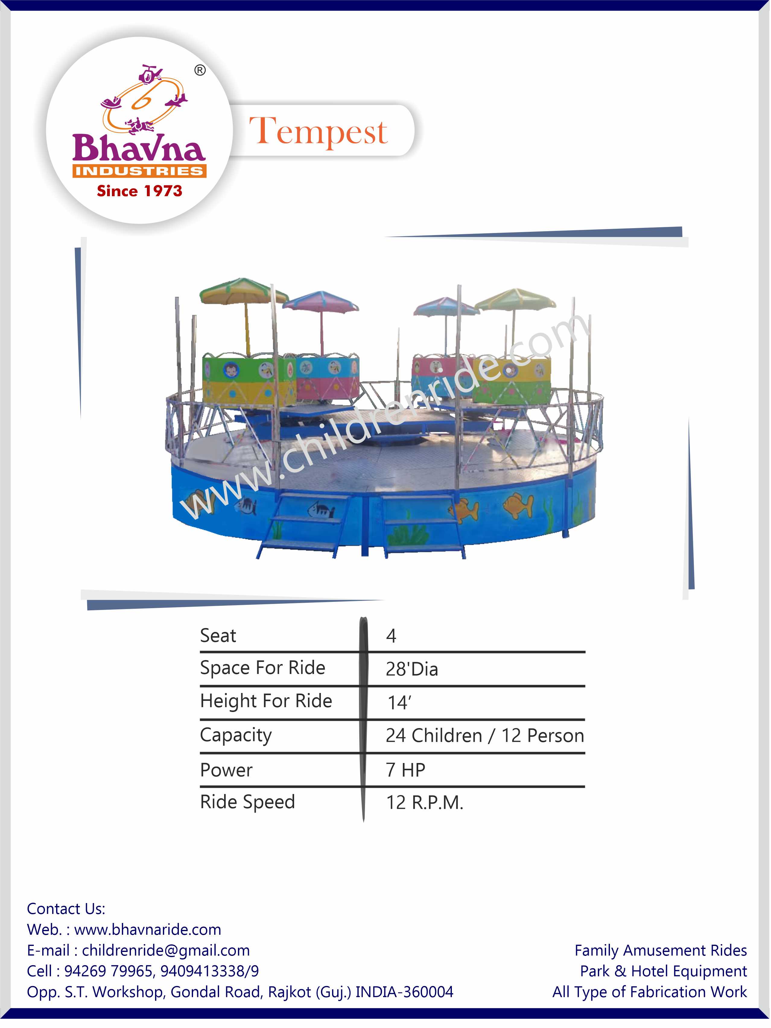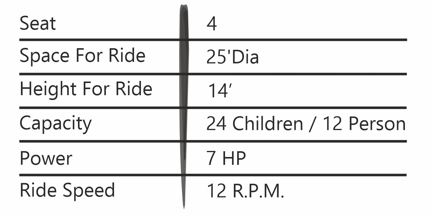 Bhavna Industries, a leading ride manufacturer in India, proudly presents the Tempest ride. The Tempest features a long main arm with two shorter arms attached at central points. When in motion, both the main and short arms rotate in the same direction. At the ends of the short arms are large seats that can accommodate up to 16 riders. The seats spin due to gravity and momentum as the ride follows a circular pattern, tilting at approximately 30 degrees. This creates a unique and exciting experience for participants.