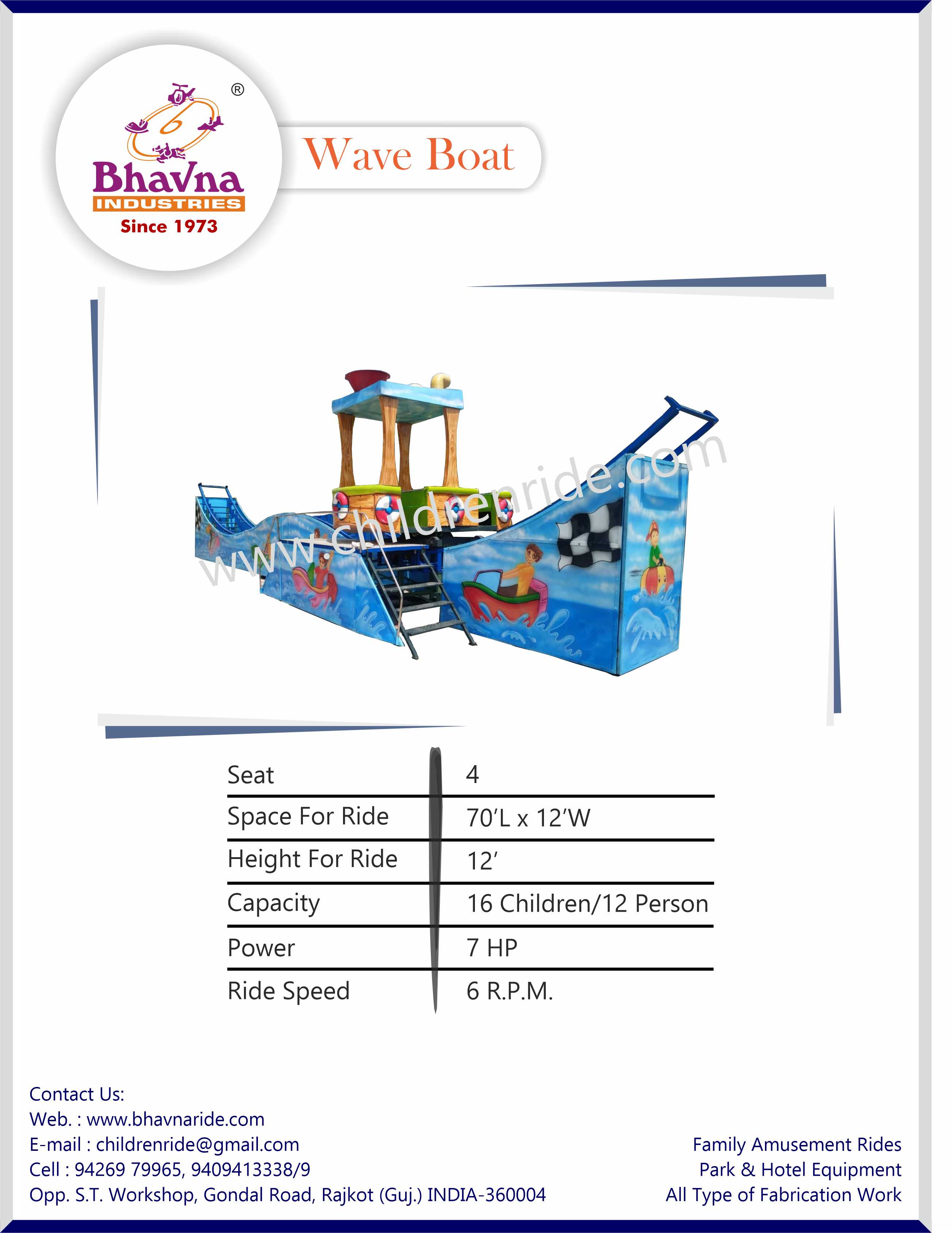 The Wave Boat is a unique attraction offered by Bhavna Industries at an affordable price. Combining dual rocking and spinning motions with distinctive motorcycle-style seating, this ride creates a visually impressive experience for all 12 riders. Highly customizable, the Wave Boat has been chosen by numerous amusement parks worldwide for its innovative design. As a patented creation of Bhavna Industries, the Wave Boat is a must-have for parks looking to provide a memorable experience for visitors.