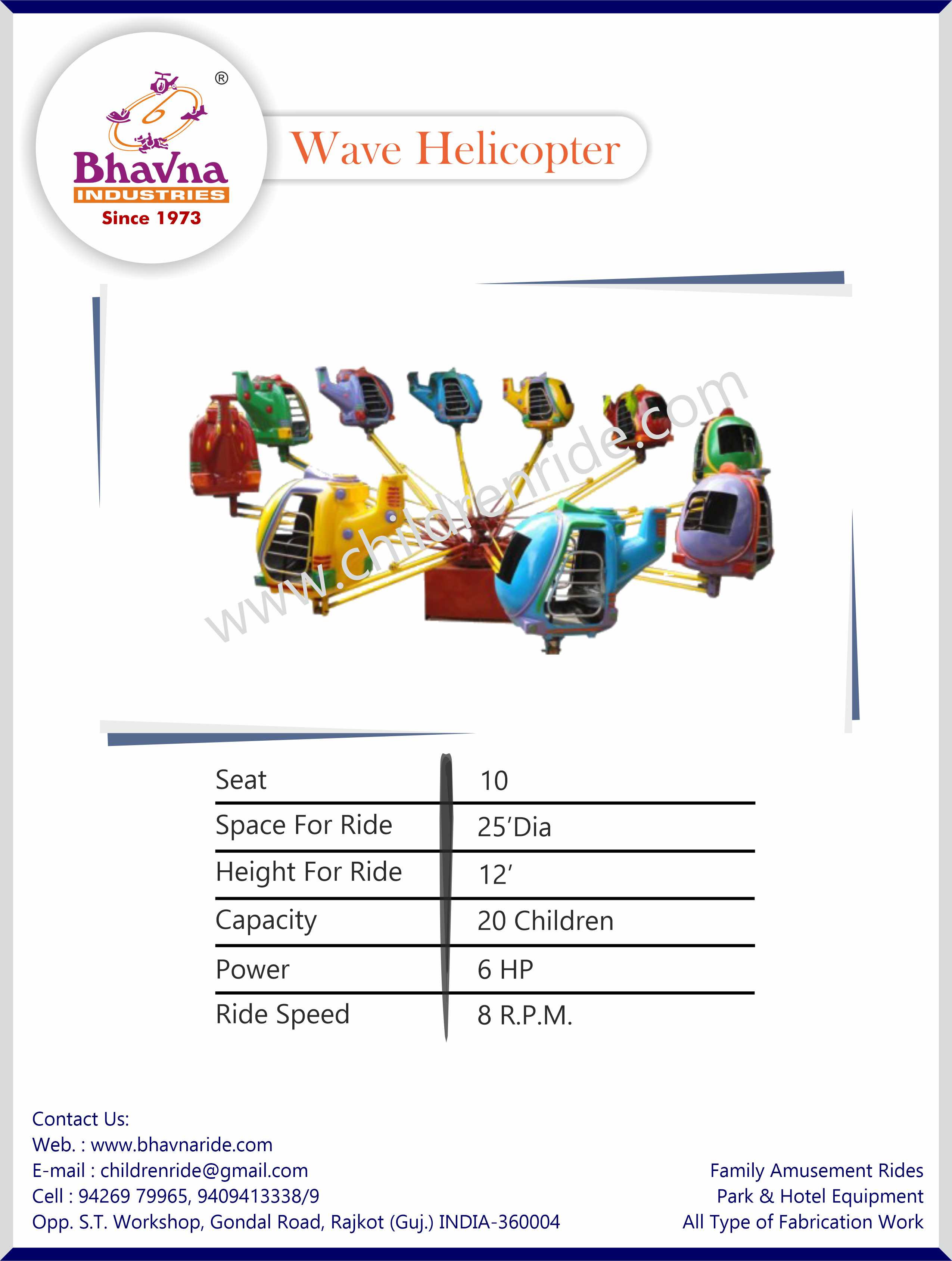 At Bhavna Industries, we specialize in manufacturing Wave Helicopter rides for theme parks, creating themed rides that captivate and entertain children. The Wave Helicopter can be customized in terms of space and seating capacity to meet your specific requirements. This fun-filled ride guarantees laughter, excitement, and joy for young riders, making it a popular attraction for parks and family entertainment centres. Designed to engage and amuse, the Wave Helicopter is perfect for drawing in younger audiences and enhancing their park experience.
