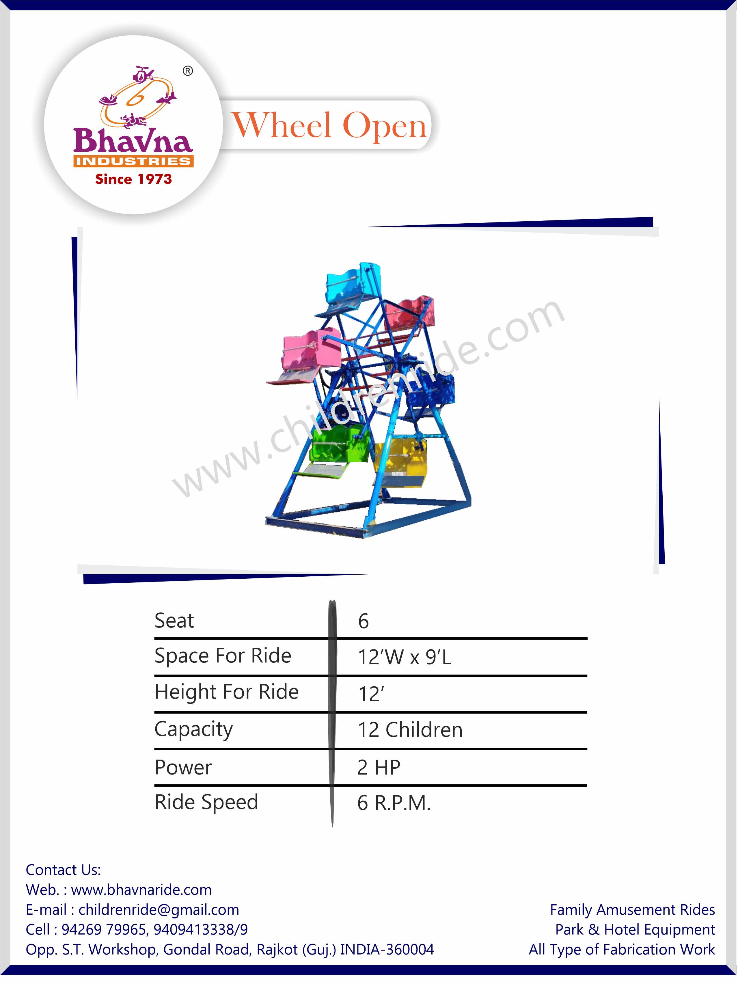 As a leading manufacturer of amusement park rides in India, Bhavna Industries offers the Wheel Open Ride, a classic spinning attraction popular with children. Designed for riders between the ages of 5 to 15, this ride ensures safety with over-the-shoulder restraints, footrests, and seatbelts. The Wheel Open Ride is a great addition to family entertainment centers, fairs, and shopping malls. Its vibrant design and smooth spinning motion make it an engaging and fun experience for kids. It's also easy to operate, requiring minimal maintenance for operators.